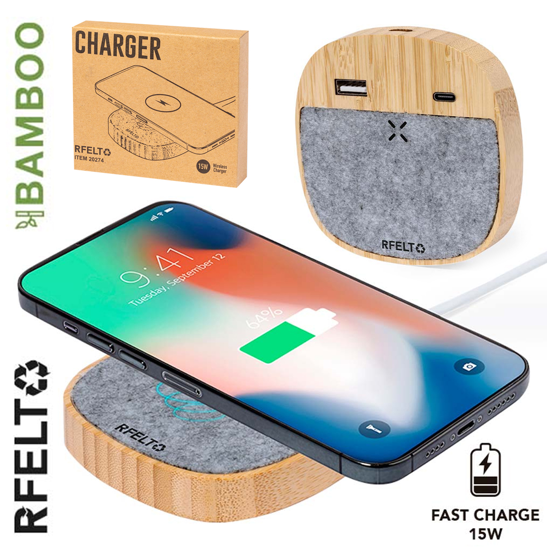 Cargador inalámbrico fabricado en bambú y fieltro RPET. Función de carga de 15W y compatible con dispositivos equipados con tecnología Qi. Incluye 2 salidas para multicarga de dispositivos: 1 salida tipo USB y una salida Tipo C. Con distintivo RPET. Amplia superficie de marcaje, presentado en atractiva caja de diseño kraft.El fieltro RPET reciclado es fruto de la combinación del proceso de reciclaje de materiales plásticos junto a la técnica milenaria de fabricación del fieltro, dando como resultado un material de eco-tendencia que, además de ser de origen reciclado, también se convierte en reciclable. Inalámbrico 15W. 1 Salida USB y 1 Tipo C