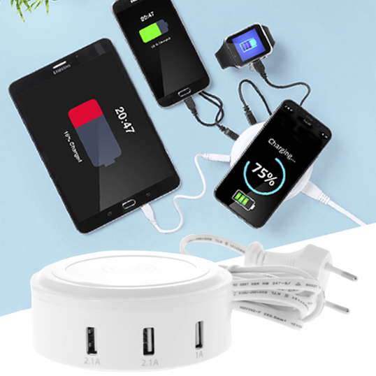 Cargador inalámbrico circular de 3.100mAh de capacidad de carga. Cuerpo en elegante acabado de color blanco. Con superficie y base antideslizante e indicador led de estado de carga. Incluye 3 salidas USB: 2x2.1A y 1x1A. Compatible con dispositivos equipados con tecnología de carga inalámbrica y presentado en atractiva caja de diseño. Inalámbrico 5W. 3 Salidas USB