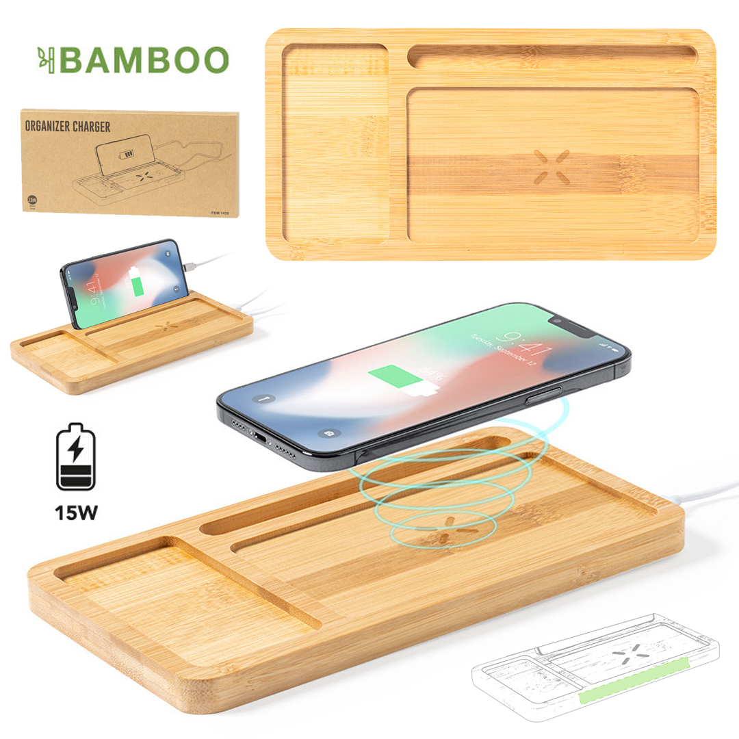 Cargador organizador inalámbrico 15W de línea nature. Con función soporte para smartphone y compartimento extra para objetos. Salida USB de 2.000 mA. Permite cargar de manera simultánea hasta 2 dispositivos (1 mediante carga inalámbrica y 1 mediante cable). Hecho en bambú procedente de cortes naturales y compatible con dispositivos equipados con tecnología de carga inalámbrica. Amplia superficie de marcaje y presentado en caja individual de diseño eco en cartón kraft. Inalámbrico 15W. Salida USB