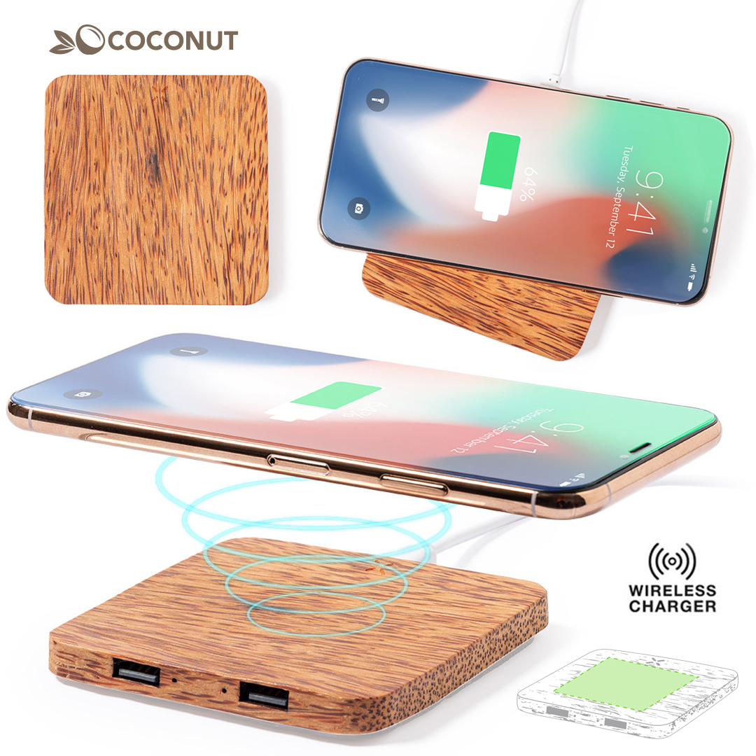 Cargador inalámbrico 10W de línea nature fabricado en coco. Tras el consumo de su fruto, del coco y su planta se pueden obtener multitud de productos, contribuyendo a la sostenibilidad del planeta y fomentando el uso de materias primas naturales. Incluye 2 salidas USB de 2100mA y es compatible con dispositivos equipados con tecnología de carga inalámbrica. Amplia superficie de marcaje y presentado en caja individual de diseño eco en cartón kraft. Inalámbrico 10W. 2 Salidas USB