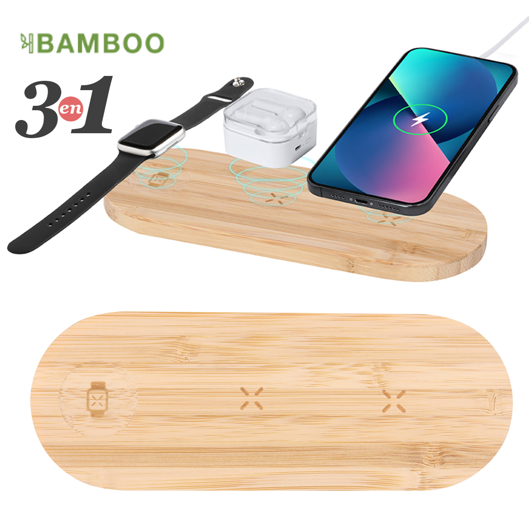 Multicargador inalámbrico de 15W fabricado en bambú. Diseñado para la carga simultánea del smartphone, auriculares y smartwatch: una estación de carga todo en uno, versátil y con indicadores luminosos de carga en parte trasera.Materiales como el bambú fomentan la utilización de materias primas naturales, reduciendo las emisiones contaminantes. Proviene de una planta de gran resistencia y versatilidad, con crecimiento y regeneración rápidos, siendo una excelente alternativa al uso de madera tradicional.Fabricado conforme a los estándares RoHS y en cumplimiento con los siguientes requisitos de seguridad:Sistema de protección contra sobrecalentamiento. Sistema de protección contra sobrecarga. Sistema de bloqueo para evitar cortocircuitos. Inalámbrico 15W