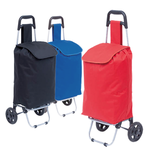 Carro de compra plegable en resistente poliéster 600D de variada gama en vivos colores. Con asas reforzadas, cuerpo metálico tubular, bolsillo de cremallera posterior y soportes con gomas de protección. Ruedas reforzadas de alta calidad. Plegable