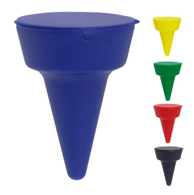 Resistente cenicero portátil con cuerpo acabado en vivos colores y pincho de anclaje.
