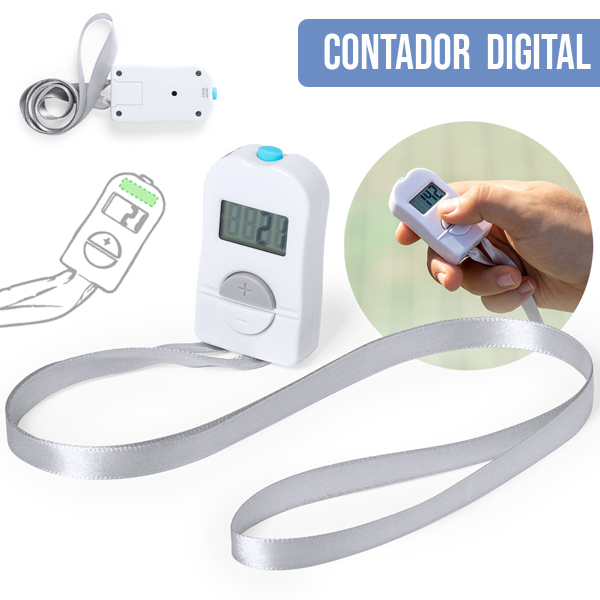 Contador de aforo digital fabricado en resistente material ABS de acabado brillo, con práctica cinta de poliéster y amplios pulsadores para añadir o restar aforo. Pantalla digital con contador de 4 dígitos y botón de reinicio en parte superior. Amplia superficie para logotipo, especialmente diseñado para marcaje en tampografía. Presentado en atractiva caja individual de diseño. Alimentación a pilas, de botón incluida. Pila Botón Incluida