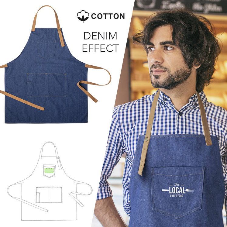 Delantal de alta calidad en resistente tela de acabado denim. De corte por debajo de la rodilla, con cinta de cuello ajustable por botón, cintas para la cintura en color marrón, reforzadas. Incluye multitud de bolsillos para llevar cómodamente los distintos utensilios, con costuras reforzadas y remaches metálicos.