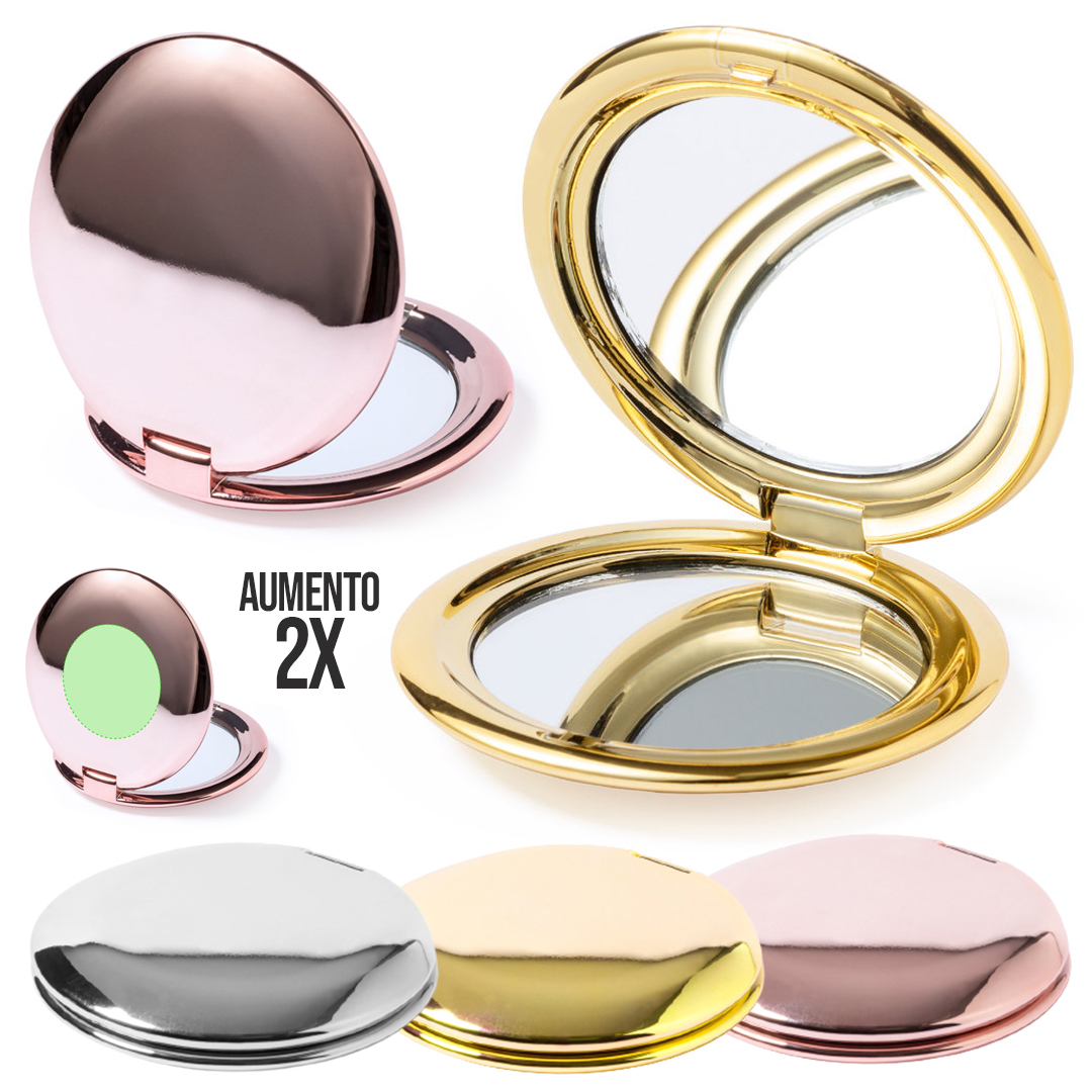 Espejo plegable en elegante acabado metalizado. Con dos espejos interiores (1X y aumento 2X), disponible en colores dorado, plateado y oro rosa. 1 Aumento 2X