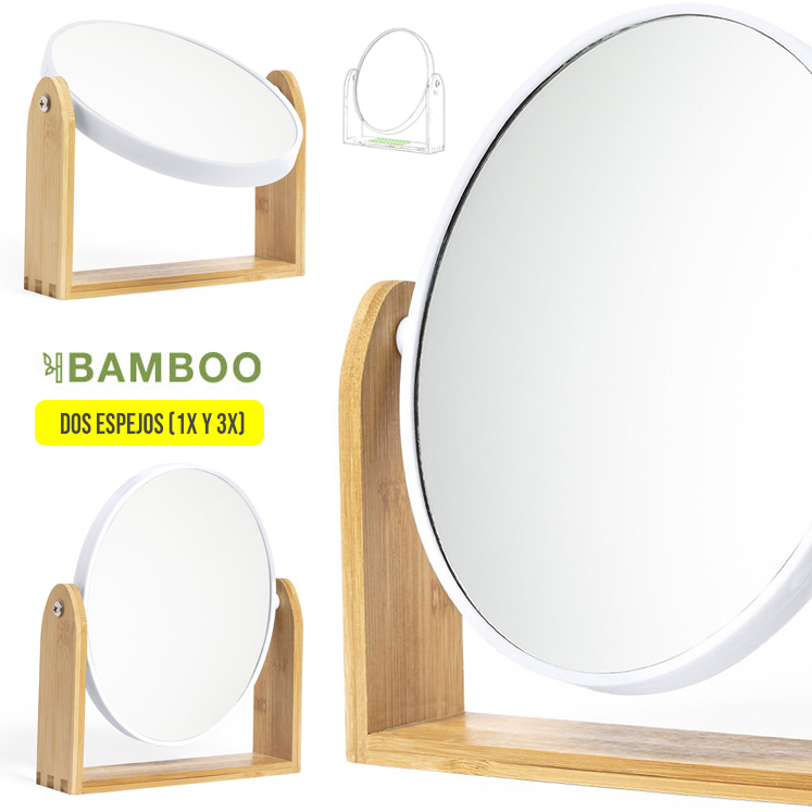 Espejo de sobremesa de línea nature fabricado en bambú. Con dos espejos (1X y 3X). Presentación en caja individual de diseño eco. 1 Aumento 3X
