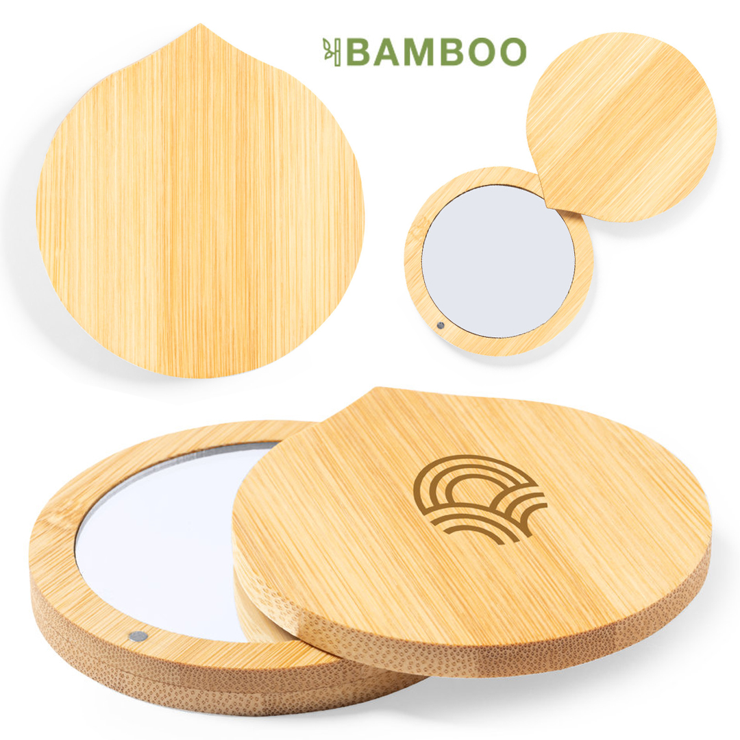 Espejo 1X de línea nature, con carcasa fabricada en bambú y cierre magnético. Presentado en caja individual de diseño kraft.
