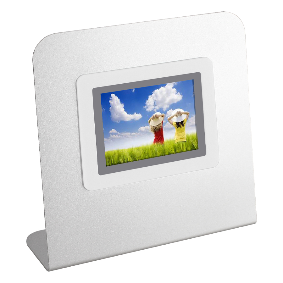 Estación Digital Porta-Fotos con marco metálico autosustentable, pantalla LCD 2.4" desmontable. Multi-idioma con Reloj, Alarma y Calendario. Memoria interna de 8MB. Incluye batería de litio de 3.7V-180MAH y fuente USB/Mini-USB 5V.