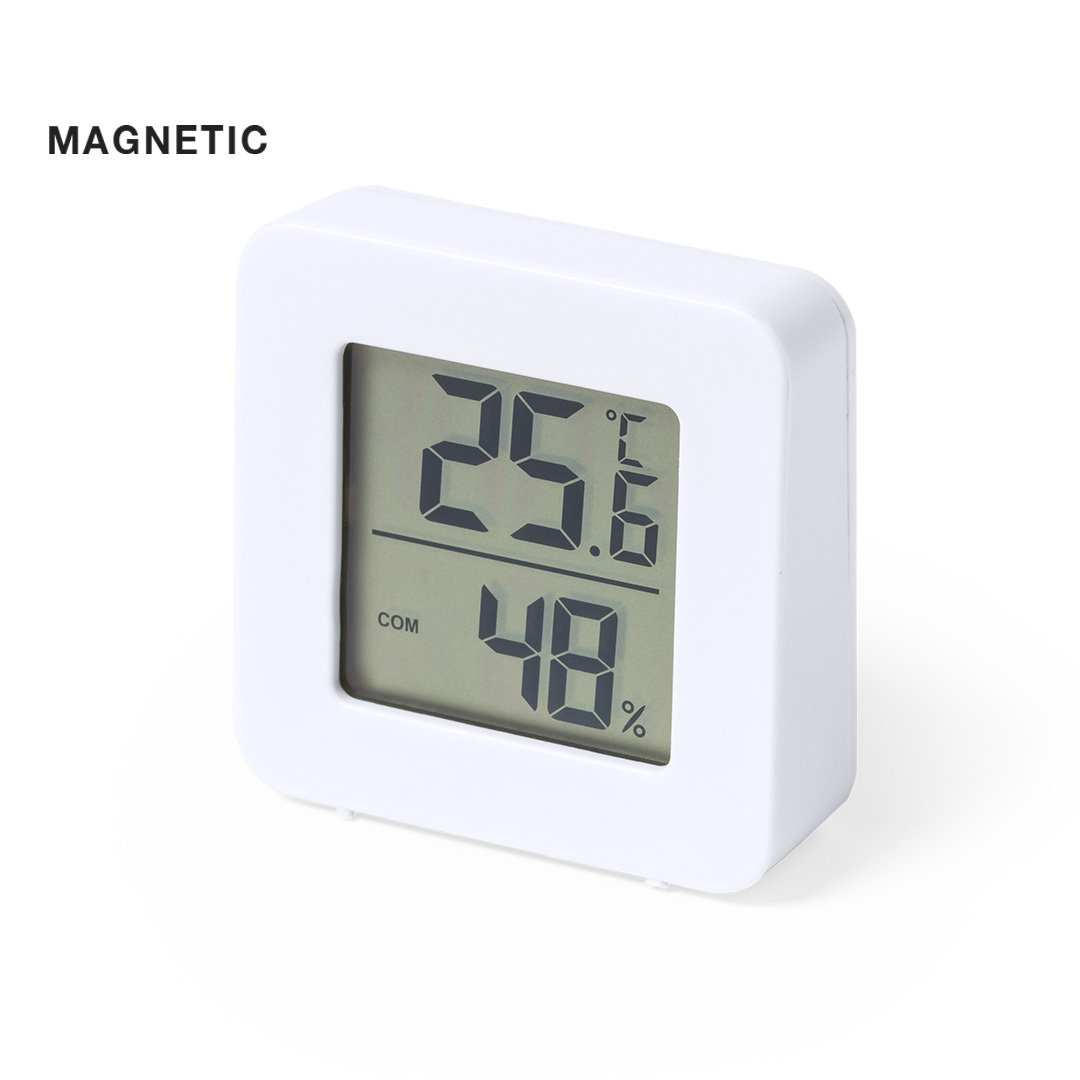 Estación meteorológica fabricada en resistente ABS de acabado blanco. Pantalla LCD de fácil lectura con termómetro y medidor de humedad. Fijación magnética y alimentación con pila (de botón incluida, con film protector). Presentada en caja individual de diseño kraft, con manual de instrucciones en español e inglés. Magnético. Pila Botón Incluida