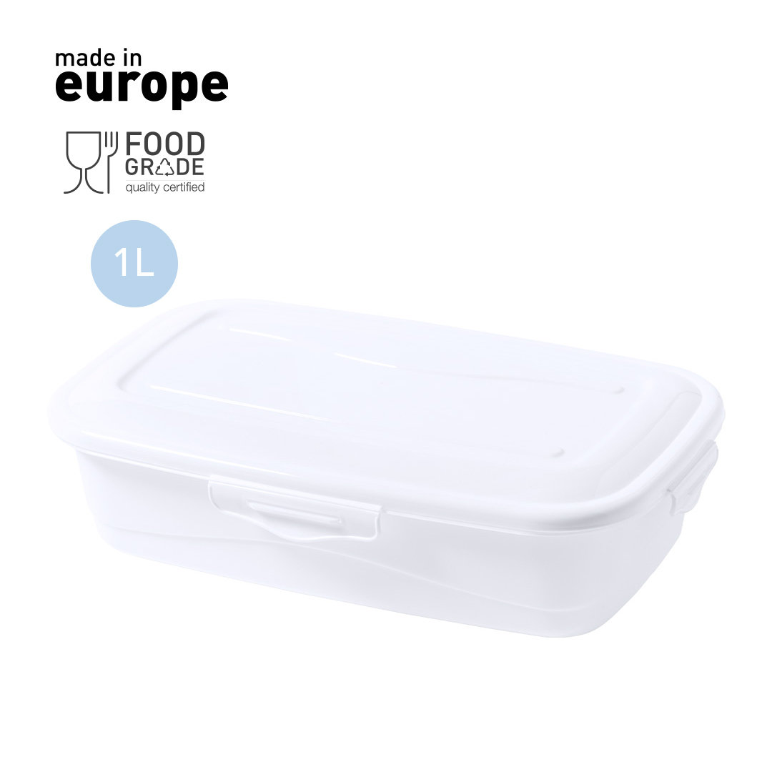 Fiambrera de 1L de capacidad, hecha en PP de color blanco. De fabricación europea y con certificación Food Grade, garantizando la seguridad cuando los alimentos entran en contacto con el material usado para fabricar el producto. Formato rectangular, con cierre de seguridad en todos sus lados. 1 L