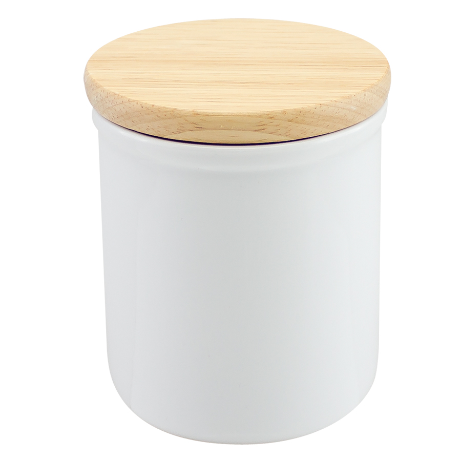 Frasco cerámico de Cocina , para Sublimación. Contiene tapa de madera de Bamboo con anillo de goma aislante. Presentación en caja de cartón.