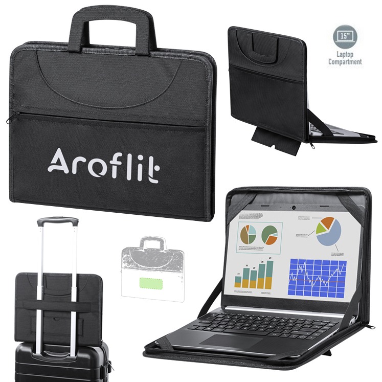 Funda soporte multifunción de alta calidad para ordenador portátil de hasta 15 pulgadas, fabricada en resistente nylon 1200D y de elegante acabado en color negro. Accesorio para ajuste en trolley, con soporte integrado en el exterior, elásticos de sujeción y acolchado interior para garantizar la seguridad durante el uso y el transporte del ordenador. Asas abatibles imantadas, con compartimento principal y bolsillo exterior con cierre de cremallera y tiradores metálicos. Acolchada