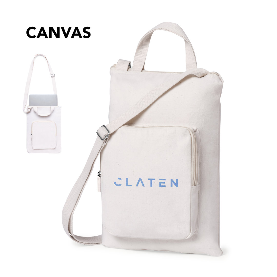 Original funda para ordenador portátil, fabricada en resistente canvas de acabado natural. Compartimento principal con cierre de cremallera a juego y asa de transporte. Con cinta bandolera ajustable a juego y bolsillo exterior con cierre de cremallera. Para ordenador portátil o tablet de hasta 15 pulgadas. El canvas es un tejido muy versátil y duradero, compuesto en su mayor medida de algodón. Contribuye al cuidado del medio ambiente, ya que gracias a su resistencia ofrece una gran capacidad de reutilización.