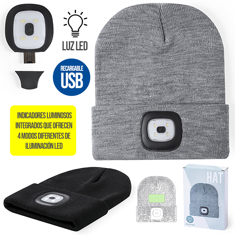 Gorro deportivo de doble capa con indicadores luminosos integrados que ofrecen 4 modos diferentes de iluminación LED. En suave y confortable material acrílico. 4 Ledes. 4 Posiciones de Luz, Fija e Intermitente. Batería 300 mAh