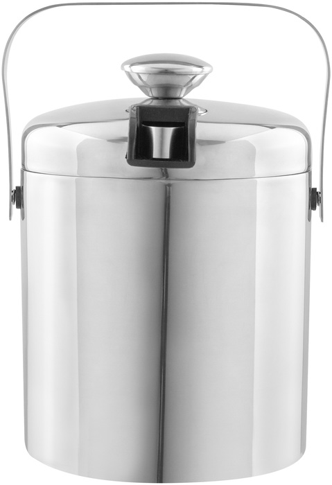 Ø 14 x 14 cm. Capacidad 1100 ml. Acero inoxidable. Interior en acero 304 y exterior en acero 201. Hielera de mesa con tapa. Pinza para hielo de acero inoxidable, encastrable en la misma tapa. Asa de acero inoxidable para transportar. Presentación en caja de regalo kraft.