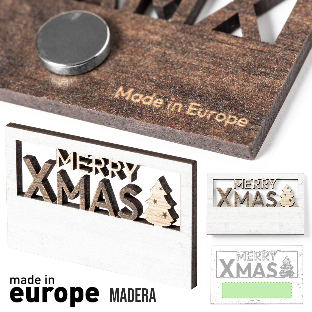 Original imán Merry Christmas fabricado en madera natural, con texto troquelado y de original acabado bicolor. Amplia superficie de marcaje y distintivo Made In Europe.
