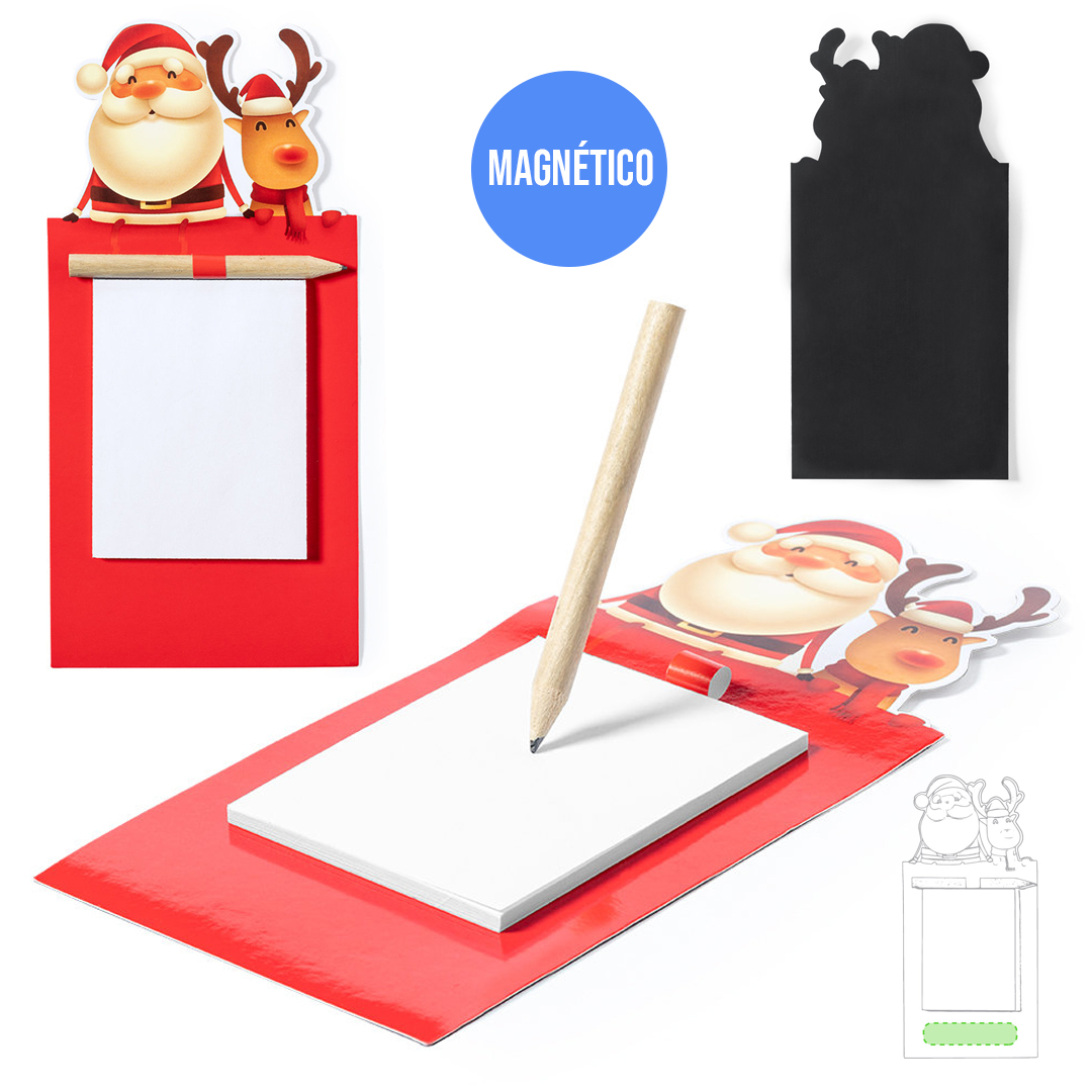 Imán con bloc de notas en divertido diseño navideño de Papá Noel y Reno. Incluye 40 hojas lisas y lápiz de madera natural. Bloc 40 Hojas. Lápiz Incluido