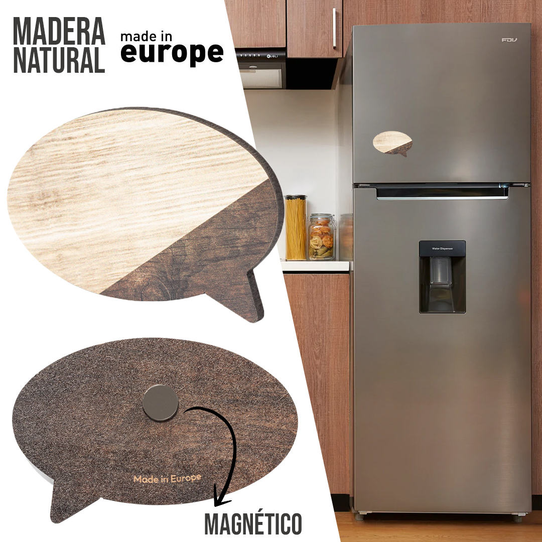 Original imán bocadillo fabricado en madera natural y de acabado bicolor. Amplia superficie de marcaje y distintivo Made In Europe.