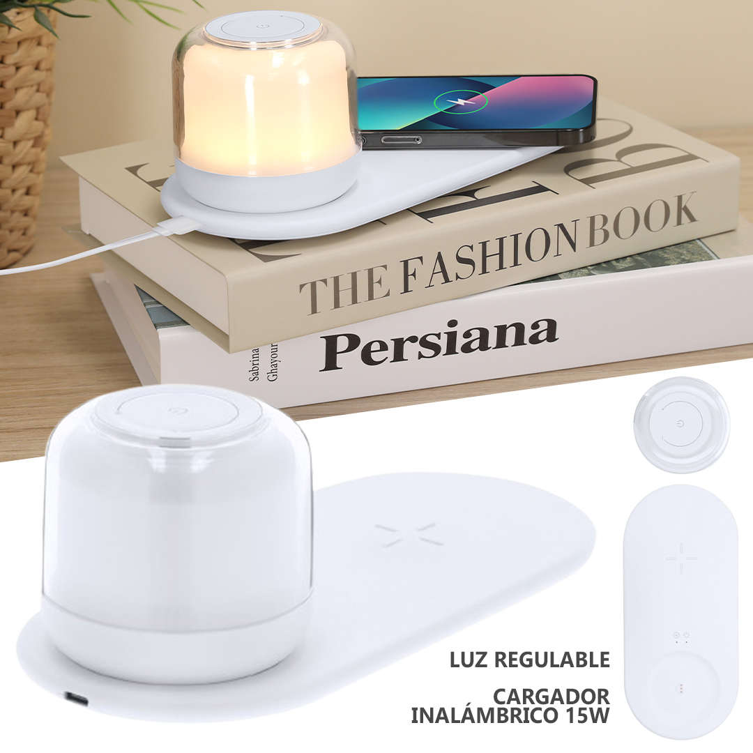 Lámpara multifunción. Incluye:- Lámpara portátil de carga inalámbrica de 12 LEDs. Con 2 posiciones de luz regulables por botones táctiles: luz blanca y multicolor. - Cargador inalámbrico de 15W. 12 Ledes. 2 Posiciones de Luz. Intensidad de Luz Regulable. Cargador Inalámbrico 15W. Conexión USB. Batería 600 mAh