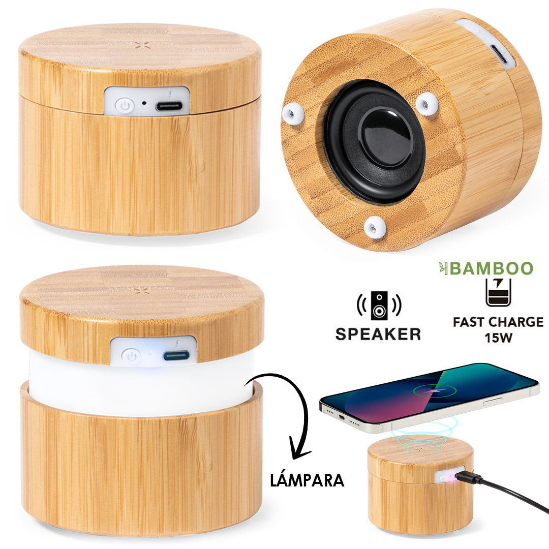 Lámpara multifunción fabricada en bambú. Con altavoz Bluetooth® 5.0 de 3W de potencia y cargador inalámbrico de 15W. 2LEDs. Compatible con dispositivos móviles de carga inalámbrica, con cable cargador tipo C y viene presentada en una atractiva caja de diseño kraft. Disponible manual de instrucciones en español e inglés.Elaborado con elementos vegetales para así fomentar la utilización de materias primas naturales y reducir las emisiones contaminantes. 2 Ledes. Altavoz Conexión Bluetooth. Potencia Sonido 5W. Batería 400 mAh. Cargador Inalámbrico 15W. Conexión USB