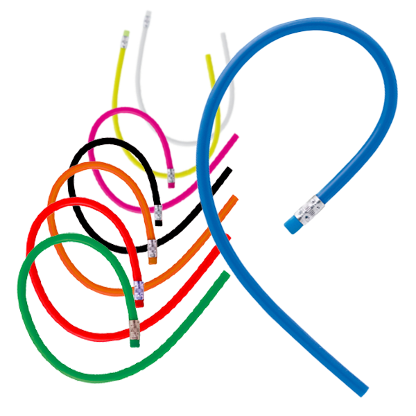 Lápiz flexible extra largo, de acabado brillo. Con cuerpo redondo y goma de borrar a juego. Disponible en variada gama de colores, con mina negra y punta sin afilar. Flexible