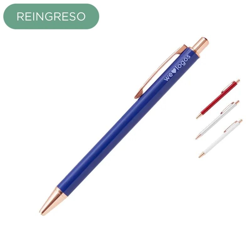 Lápiz de cuerpo de aluminio con detalles en tono cobre. Tinta color azul. Sistema de apertura retractil