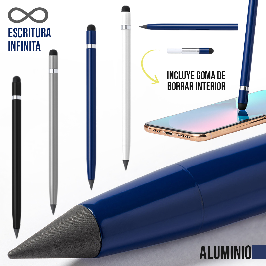 Lápiz puntero eterno, fabricado en resistente aluminio de acabado metalizado y con anilla cromada. Reutilizable y con escritura infinita, para así usar siempre el mismo lápiz y no generar residuos. Incluye goma de borrar en la parte interior del lápiz y está disponible en variada gama de colores.