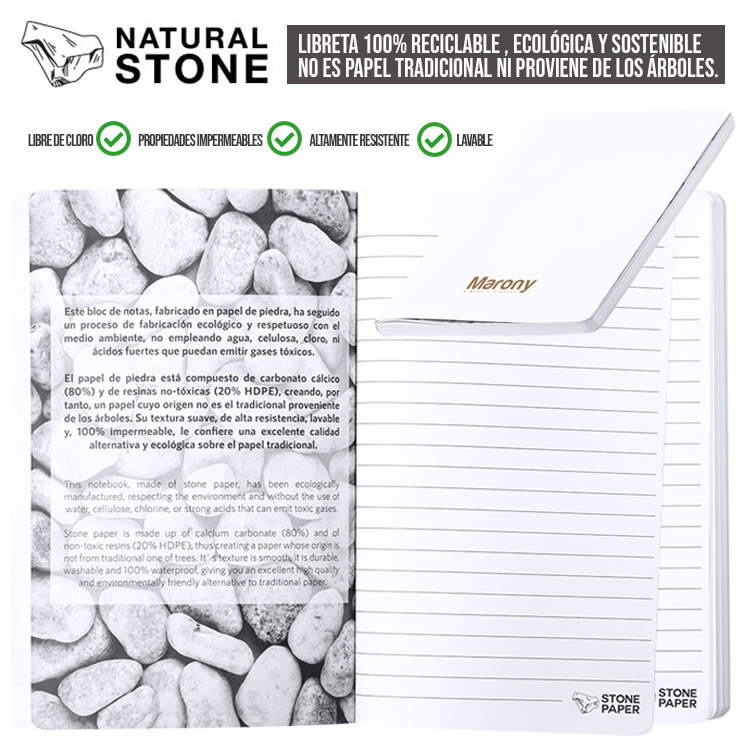 Libreta de línea nature fabricada a base de extractos de piedra, en elegante acabado de color blanco. Tapas flexibles, con ilustración eco en el interior de la portada y 60 hojas de 150 g/m2 con disposición a una raya. El material usado en la elaboración de la libreta es 100% reciclable y libre de cloro, con propiedades impermeables, altamente resistente y lavable, convirtiéndose así en una alternativa ecológica y sostenible frente al papel convencional, cuyo origen no es el tradicional ni proviene de los árboles. 60 Hojas
