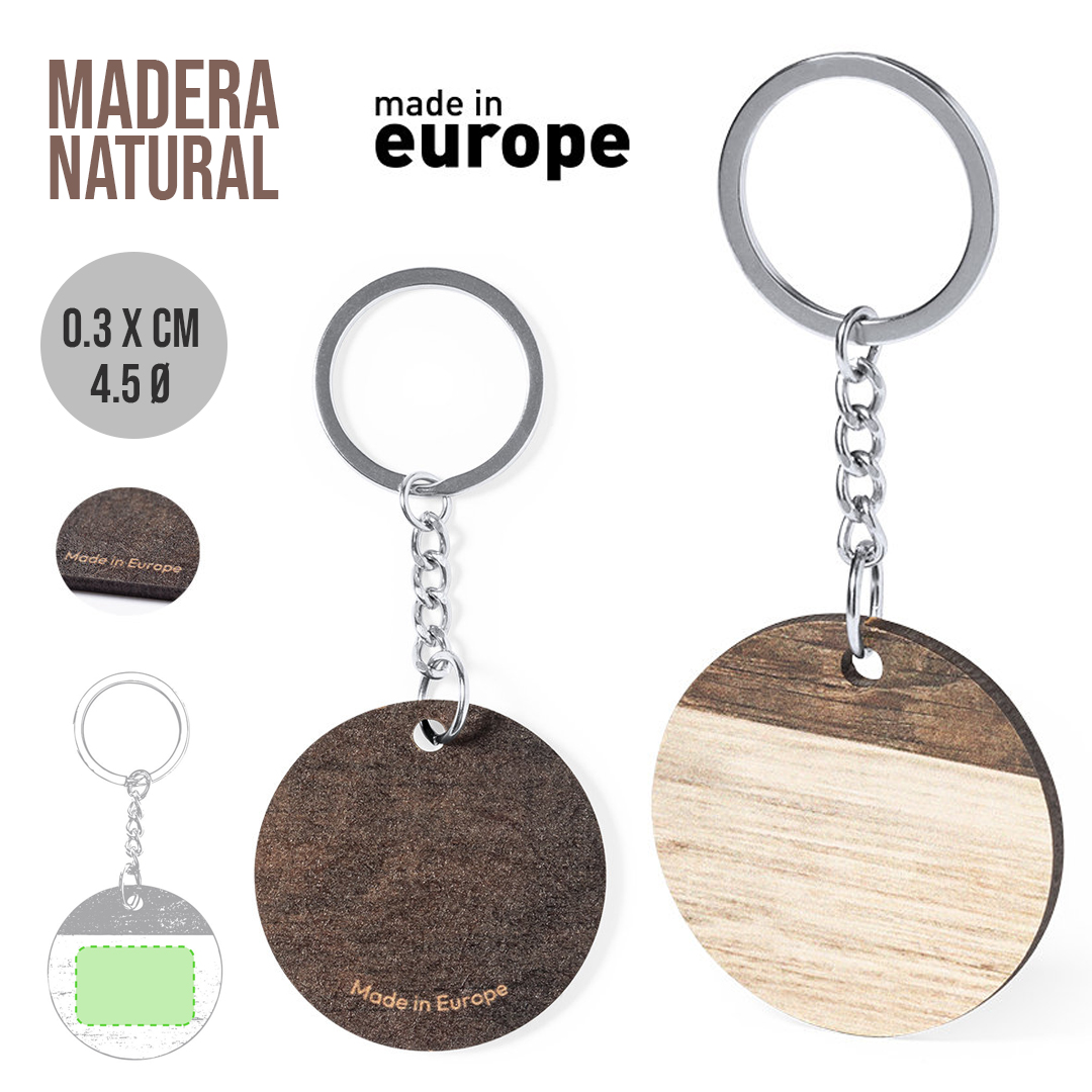 Llavero redondo, fabricado en madera natural y de original acabado bicolor. Amplia superficie de marcaje, con anilla y cadena metálicas y distintivo Made In Europe.