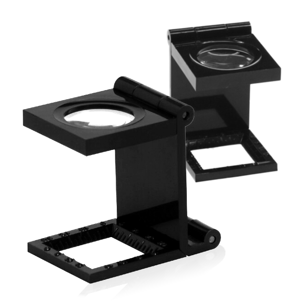 Lupa plegable cuentahilos de 7 aumentos. Con regla de medición integrada en cuerpo y presentada en caja individual. Con Regla para Medición