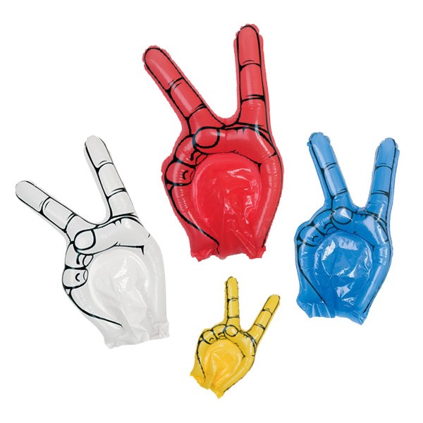 Divertida mano de animación victoria en resistente material LDPE de vivos colores. Reutilizable y con válvula de inflado incluida. Reutilizable. Válvula Inflado Incluida