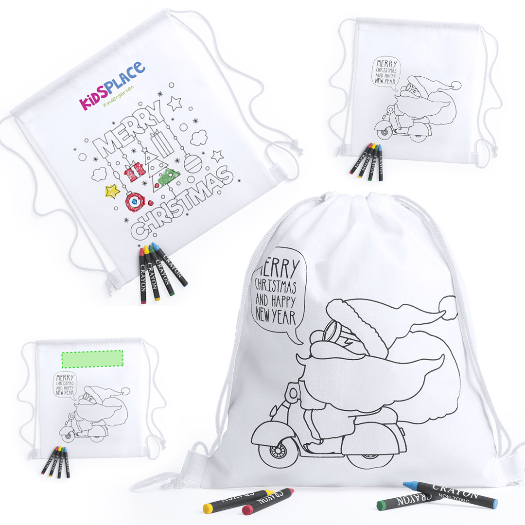Mochila navideña infantil de non-woven en color blanco especialmente diseñada para colorear con ceras. Incluye 4 ceras en variados colores. Con cuerdas autocierre a juego y refuerzos en las esquinas. Disponible en diseños Merry Xmas y Papá Noel. 4 Ceras Incluidas
