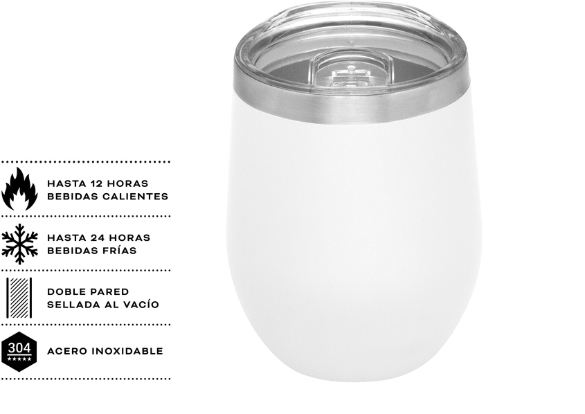 Mug doble pared, sellado al vacío. Interior en acero 304 y exterior en acero 201. Tapa plástica transparente a presión con anillo de silicona. Pintura powder coat (pintura más duradera y resistente a la corrosión y el paso del tiempo). Mantiene hasta 12 hs la temperatura de las bebidas calientes y 24 hs de las bebidas frías.