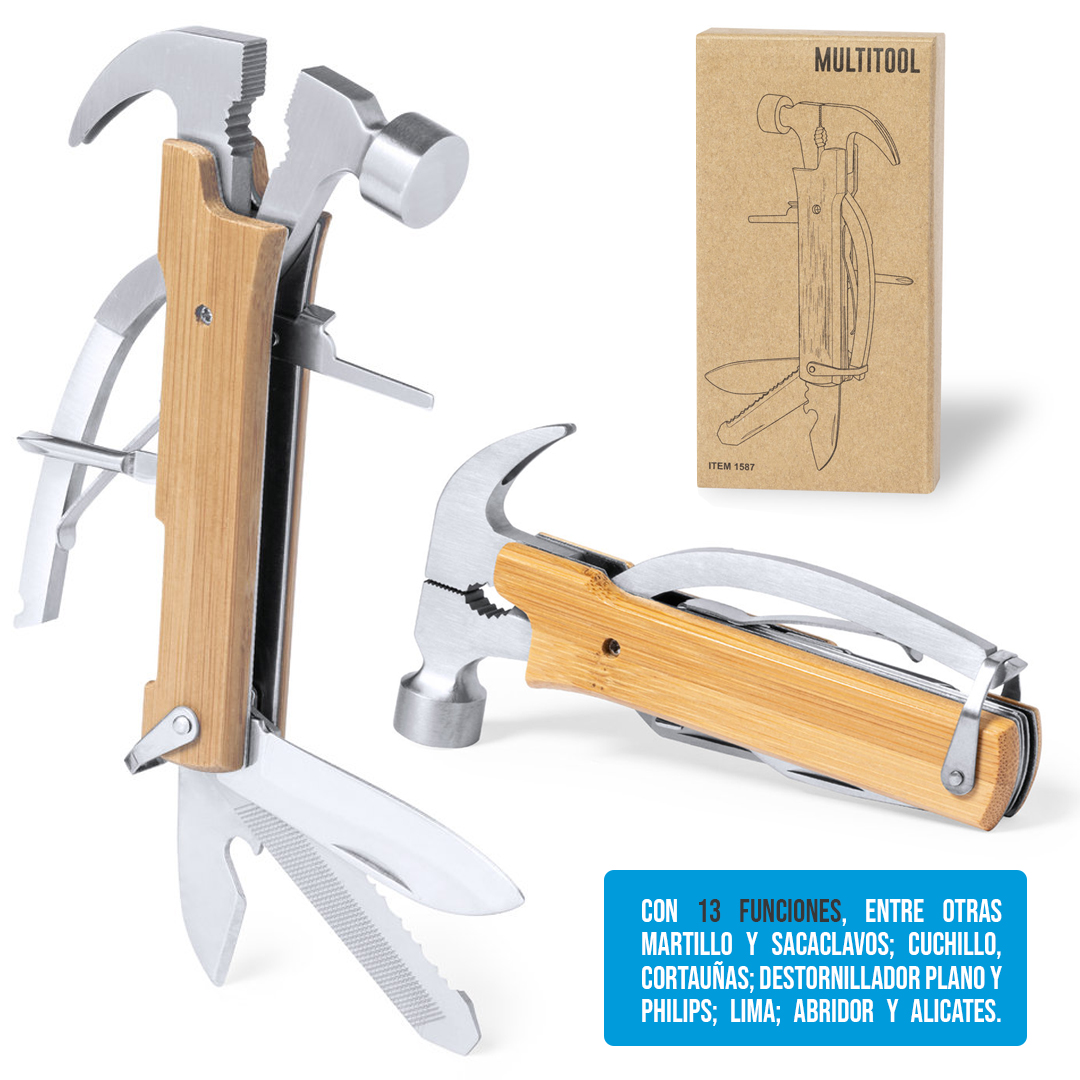 Multiherramienta de línea nature, con resistente cuerpo en acero inox y empuñadura de bambú. Con 13 funciones, entre otras martillo y sacaclavos cuchillo y cortauñas destornillador plano y philips lima abridor y alicates. Cordón a juego en polipiel y presentada en caja individual de diseño kraft. 13 Funciones