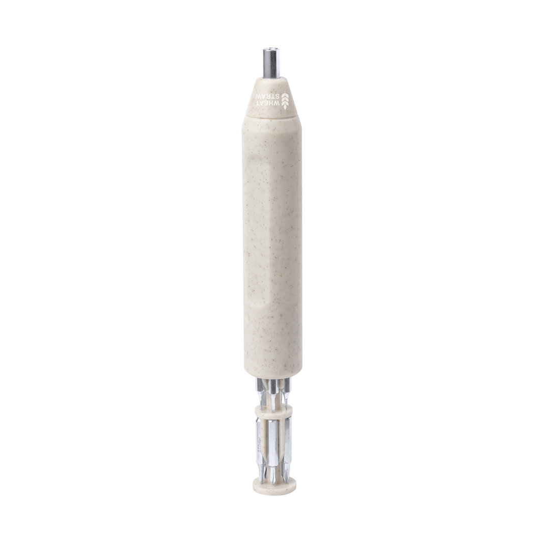 Práctica multiherramienta fabricada en caña de trigo con forma de destornillador. Incluye un compartimento en la empuñadura para guardar las múltiples puntas magenéticas (planas y philips). Con logotipo caña de trigo incluido. Presentada en caja de diseño kraft. La caña de trigo fomenta la utilización de materias primas naturales, reduciendo así las emisiones contaminantes. 10 Accesorios