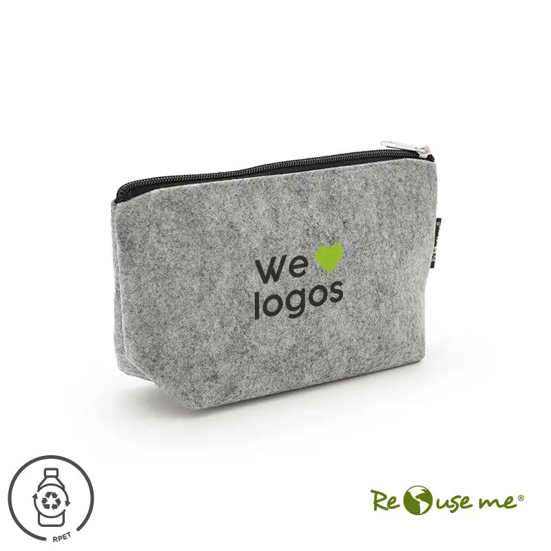Neceser de fieltro RPET en color gris, confeccionada a partir de botellas recicladas. Dimensiones: 22 x 14 x 6,5 cm. Ideal para transportar los elementos de cuidado personal en viajes y bolsos de deporte. ReUseMe