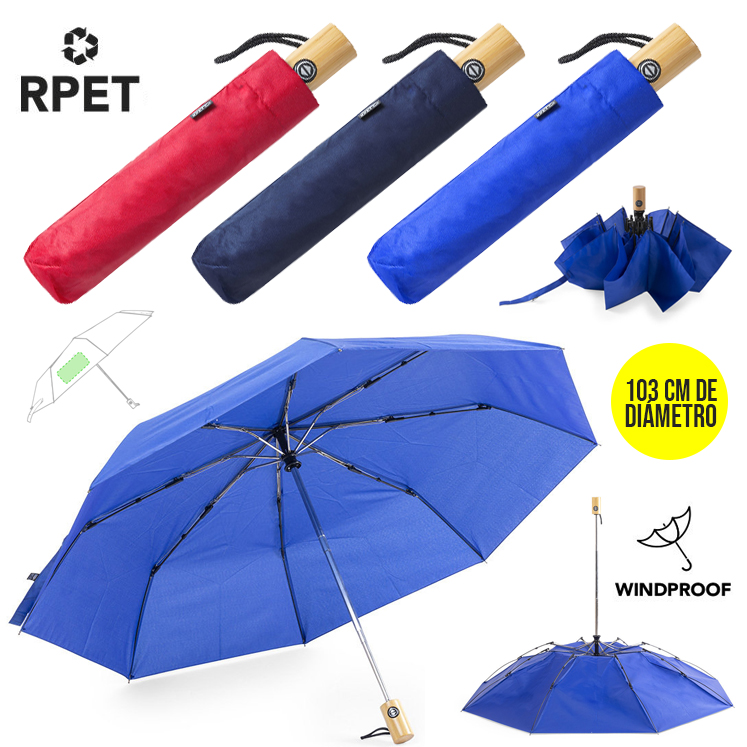 Paraguas plegable de línea nature de 103cm de diámetro. En material pongee 190T RPET, elaborado a partir de plástico reciclado, para así fomentar la reutilización de residuos plásticos y ayudar a la sostenibilidad del planeta. De apertura y cierre automáticos, con mecanismo anti viento y varillas de fibra de vidrio. Mango de bambú con botón, distintivo RPET en etiqueta y disponible en variada gama de colores. Funda RPET a juego incluida. 23"". Apertura y Cierre Automático. Sistema Antiviento. Mango Bambú. Funda Pongee RPET