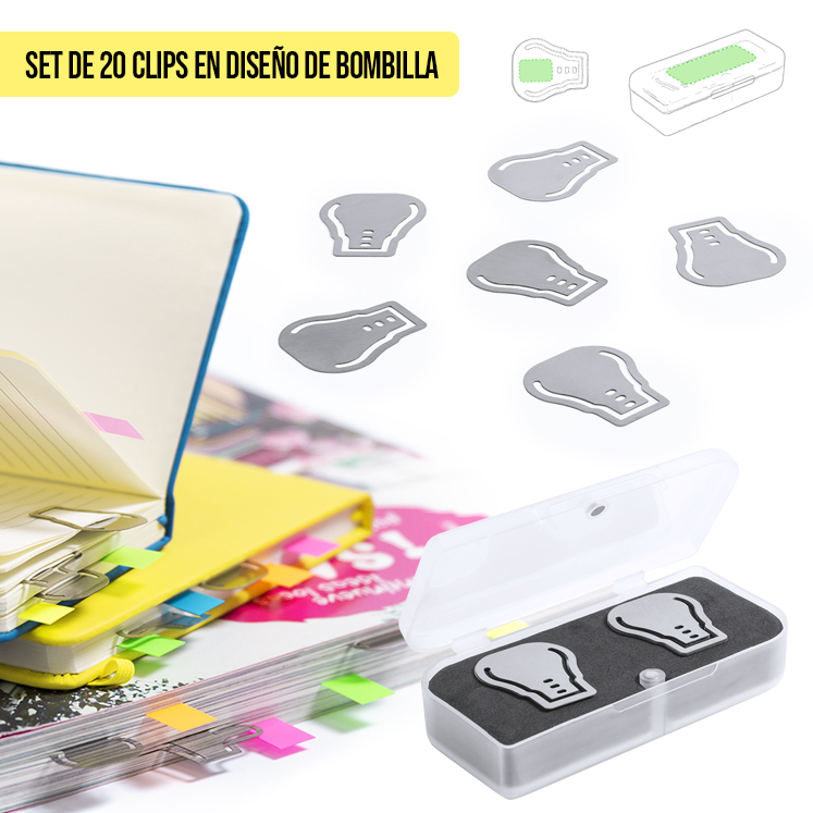 Set de 20 clips en diseño de bombilla. Presentados en estuche individual de PVC translúcido con cierre magnético e interior troquelado en suave espuma. 20 Clips Incluidos