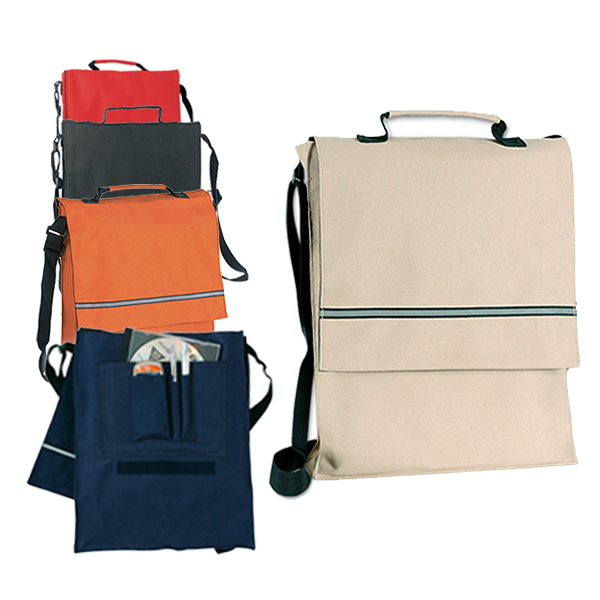 Portadocumentos con solapa de cierre de velcro en poliéster 600D de vivos colores y con franja frontal reflectante. Con asas reforzada a juego, cinta bandolera ajustable y compartimentos interiores con fundas para bolígrafos y smartphone.