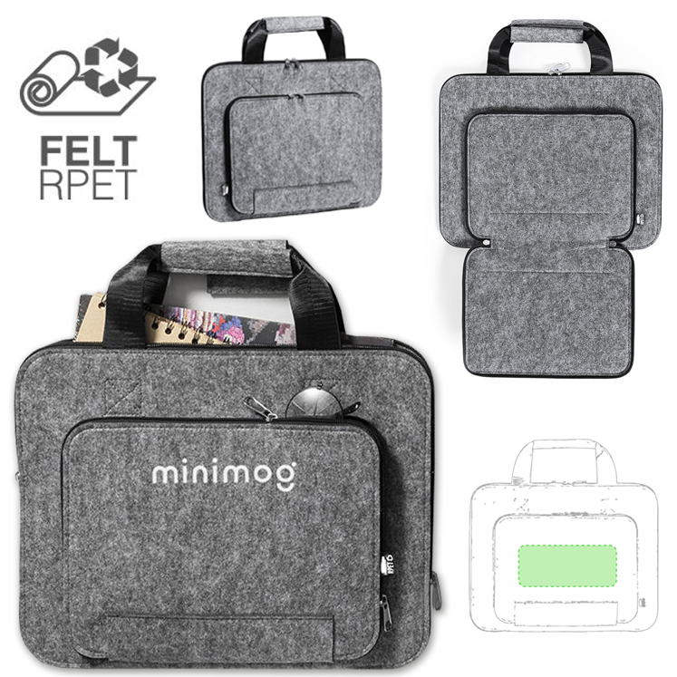 Portadocumentos de línea nature y en resistente fieltro RPET reciclado, fruto de la combinación del proceso de reciclaje de materiales plásticos junto con la técnica milenaria de fabricación del fieltro, dando como resultado un material de eco-tendencia que, además de ser de origen reciclado, también se convierte en reciclable. Bolsillos principal y frontal con cierres de cremallera y tiradores metálicos, con asas reforzadas a juego y distintivo RPET en etiqueta exterior.
