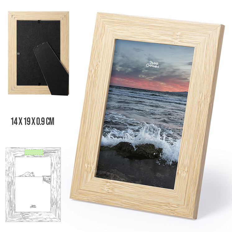 Portafotos de línea nature fabricado en MDF, con cristal de protección y soporte posterior para orientación en horizontal o en vertical. Diseñado para fotografías con tamaño de hasta 10x15 cm. Presentado en atractiva caja individual de diseño eco. Fotos: 10 x 15 cm