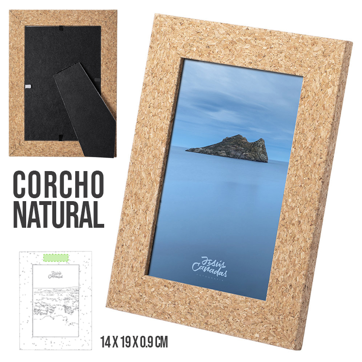 Portafotos de línea nature fabricado en corcho, con cristal de protección y soporte posterior para orientación en horizontal o en vertical. Diseñado para fotografías con tamaño de hasta 10x15 cm. Presentado en atractiva caja individual de diseño eco. Fotos: 10 x 15 cm