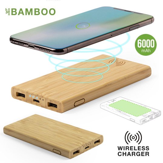 Batería auxiliar externa de línea nature con cargador inalámbrico integrado. Carcasa en bambú procedente de cortes naturales. 6.000 mAh de capacidad de carga e indicador de estado de carga. Salida USB doble y entradas Tipo C y Micro USB -cable incluido-. Capacidad de carga de hasta 3 dispositivos simultáneamente. Compatible con dispositivos equipados con tecnología de carga inalámbrica. Amplia superficie de marcaje y presentado en atractiva caja de diseño eco. Las capacidades mostradas en todas nuestras baterías auxiliares externas son reales, incorporando todas ellas baterías de grado A y no recicladas, con una vida útil de al menos 500 ciclos de carga y según normativa CE. Además, están fabricadas conforme a los estándares RoHS y en cumplimiento con los siguientes requisitos de seguridad: Sistema de protección contra sobrecarga del power bank. Sistema de protección contra descarga completa que proporciona una mayor durabilidad del power bank. Sistema de bloqueo para evitar cortocircuitos. Sistema de transferencia de carga constante, acorde con la capacidad del dispositivo de destino. Inalámbrico 5W. 6000 mAh. 2 Salidas USB y 1 Tipo C. Entrada Tipo C