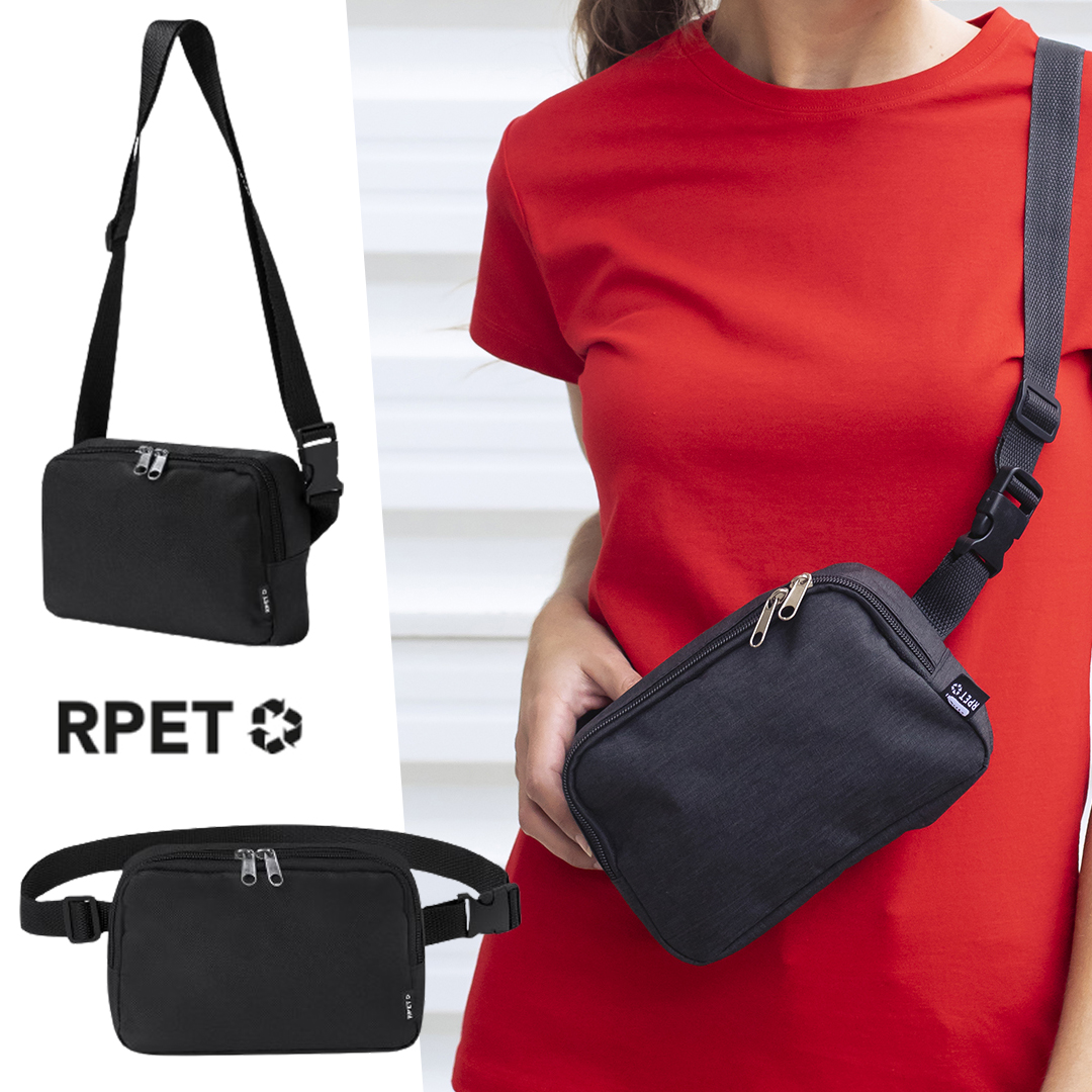 Riñonera de diseño rectangular fabricada en poliéster RPET 600D. Cuenta con un bolsillo central cierre de cremallera, con doble tirador, y cinta ajustable con cierre de hebilla. Además incluye etiqueta distintiva de RPET y viene presentada individualmente en bolsa reciclada. El material RPET se elabora a partir de plástico reciclado, para así fomentar la reutilización de residuos plásticos y ayudar a la sostenibilidad del planeta.