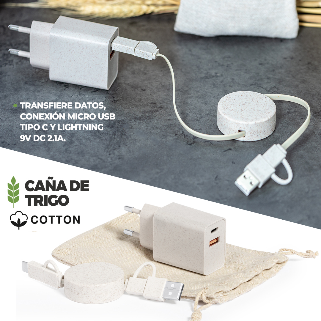 Set de cargador USB de pared con carga rápida y cable cargador con transferencia de datos, fabricados en fibra de trigo. Cargador con salida USB y Tipo C, y cable extensible con conexión Micro USB, Tipo C y Lightning. Enchufe europeo. Presentado en bolsa de algodón crudo 100% natural, con cierre de cordón.La caña de trigo fomenta la utilización de materias primas naturales, reduciendo así las emisiones contaminantes. Cable Cargador Apto para transferir datos, Cable Extensible, Conexión Micro USB, Tipo C y Lightning 9V DC 2.1A. Funda Algodón