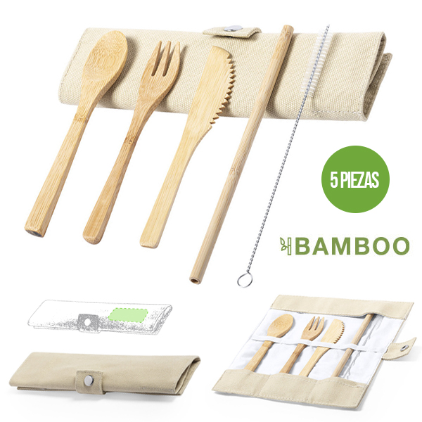 Set de cubiertos de línea nature fabricados en bambú pulido. Incluye tenedor, cuchara, cuchillo y pajita con cepillo limpiador. Presentados en funda plegable de canvas, con elástico interior para una firme sujeción de las piezas y cierre de seguridad con corchete. 5 Piezas. Funda Canvas
