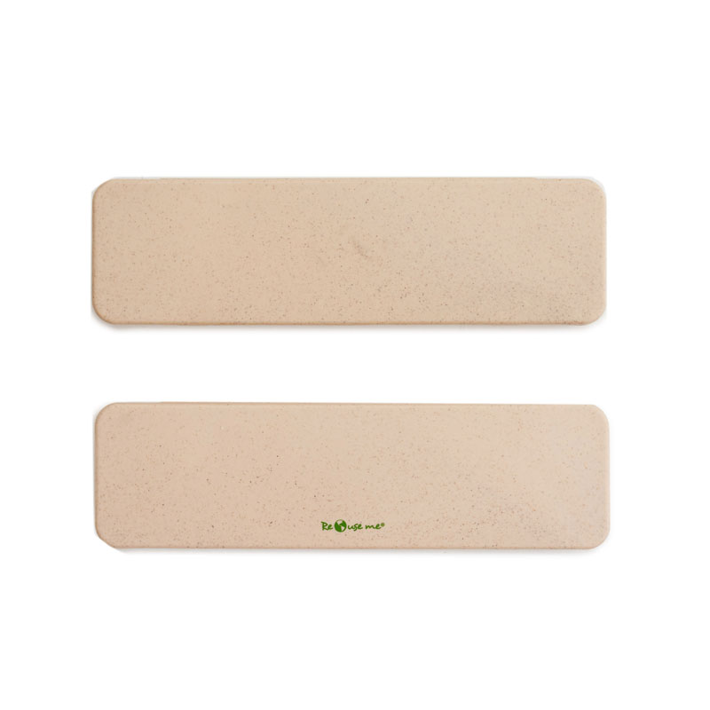 Set de cubiertos de PP y Wheat Straw, pasta de tallo de trigo, un material sustentable que reduce el consumo de plásticos vírgenes. Incluye: tenedor, cuchara, cuchillo y contenedor.