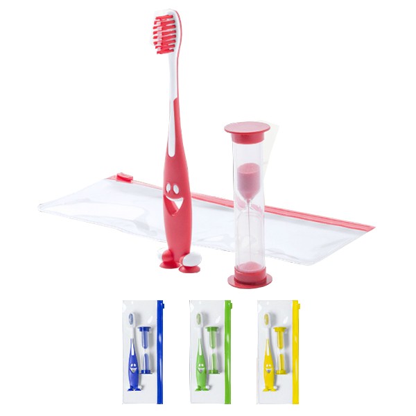 Set Cepillo de dientes y reloj de arena en llamativos colores. Incluye cepillo de divertido diseño y suave tacto con ventosas en la base y reloj de arena de 2 minutos de duración. Presentado en bolsa individual con cierre zip. Cepillo Dientes y Reloj Arena. 2 Minutos
