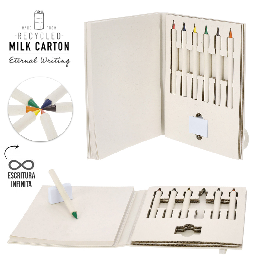 Set de lápices de colores eternos, fabricado con Cartones de Leche Reciclados. Incluye 6 diferentes colores, goma de borrar y bloc de notas con 50 hojas lisas. Con práctico elástico de cierre y distintivo de Cartones de Leche Reciclados.Los Cartones de Leche se componen en su mayor parte de cartón y aluminio. Durante su proceso de reciclado, se separan los distintos materiales del envase para su reutilización y nuevo uso, contribuyendo así a recorrer el camino infinito de la economía circular. Este material se caracteriza por su alto grado de reciclabilidad, así como por su ligereza y resistencia. 8 Piezas. Bloc 50 Hojas